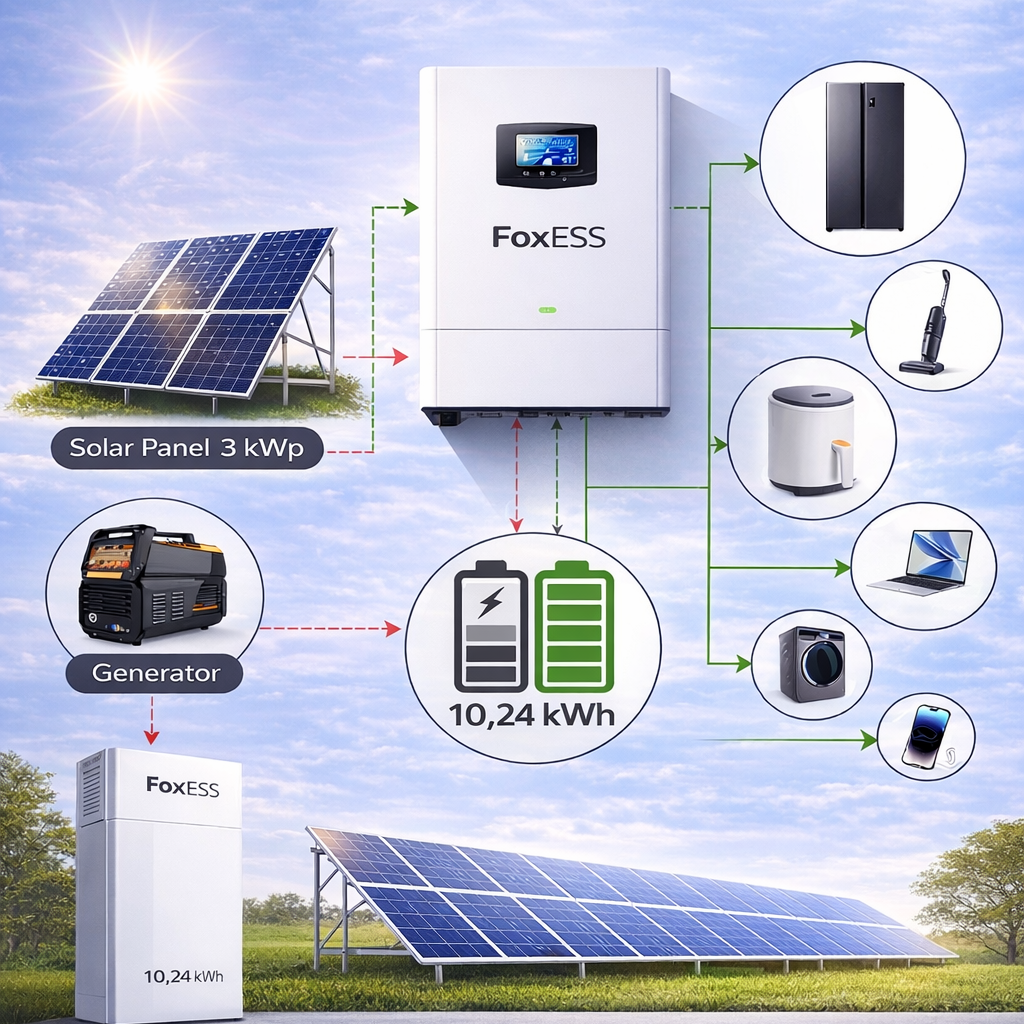 A rendszer egyfázisú FoxESS inverterrel működik, így ideális választás kisebb teljesítményigényű lakossági felhasználásra.
