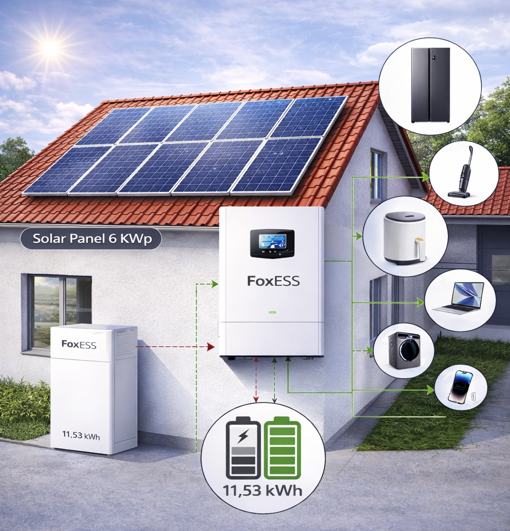 A csomag egy korszerű, energiatárolóval ellátott napelemes rendszer, amely stabil alapot biztosít az otthoni energiafüggetlenség felé vezető úton. A rendszer célja, hogy a háztartás napi villamosenergia-igényének jelentős részét saját termelésből fedezze, miközben a beépített akkumulátor segítségével a megtermelt energia később is felhasználható.
